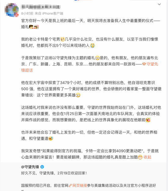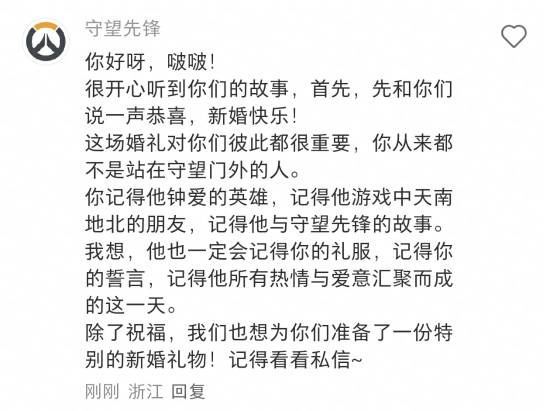 《守望先锋2》国服已官宣回归,今日,一位女网友发文表示,将和老公步入婚姻的殿堂,希望能得到官方的祝福,她想以此作为送给老公的特殊礼物。